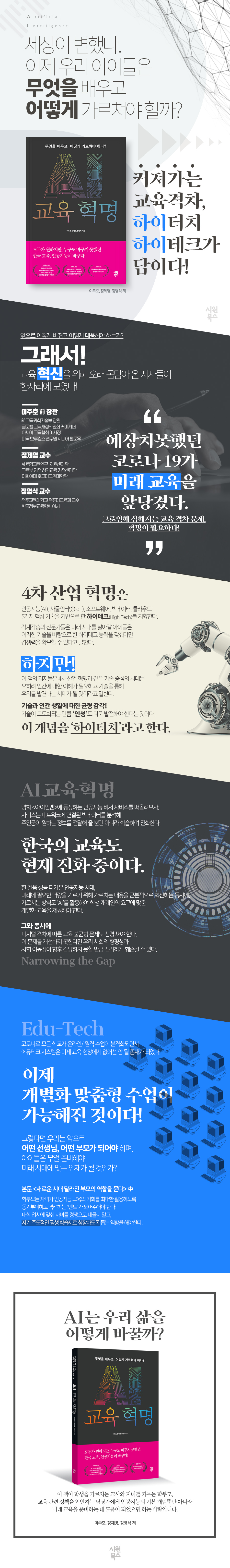 『AI교육혁명』은 어느 때보다 새로운 미래를 살아갈 자녀들을 위해 학교 교육이 어떤 역할을 해야 하는지에 대한 실천적 대안과 비전을 담은 교육 제안서다. 한 걸음 성큼 다가온 인공지능 시대에 교육은 무엇을 가르쳐야 하고, 어떻게 가르쳐야 하는가에 대한 구체적인 논의를 담고 있다. 즉 미래에 필요한 역량을 기르기 위해 가르치는 내용을 근본적으로 혁신하는 동시에, 가르치는 방식도 ‘인공지능(AI)’을 활용하여 학생 개개인의 요구에 맞춘 ‘개별화 교육’을 제공하는 대안을 제시하고 있다.
