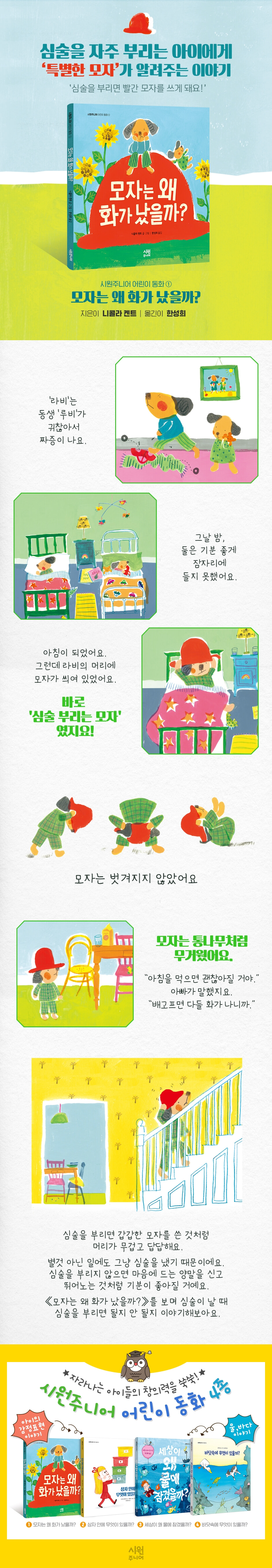 시원주니어 어린이 동화 1권 《모자는 왜 화가 났을까?》는 심술을 자주 부리던 아이가 심술을 부리지 않기로 결심하면서 훨씬 더 큰 행복을 느끼게 된 이야기에요. 심술이 났을 때 어떻게 하면 좋을지 아이가 스스로 깨달을 수 있는 시간이 될 거예요.