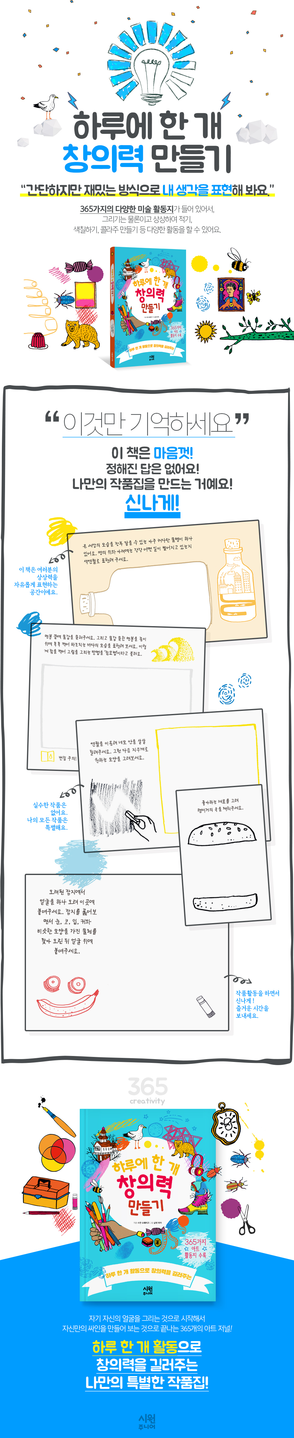 이 책은 예술적 상상력을 마음껏 펼칠 수 있도록 만들어졌습니다. 또한 365가지의 다양한 미술 활동지가 들어 있어 일 년 동안 하루도 빠짐없이 매일 작품을 남길 수 있습니다.?그리기는 물론 색칠하기, 끼적이기, 콜라주 만들기 등 다양한 활동을 경험해 볼 수 있습니다. 예술 작품을 만들고 싶을 때에는 언제든지 이 책을 펼쳐 나만의 방법으로 작품을 만들어 보세요.