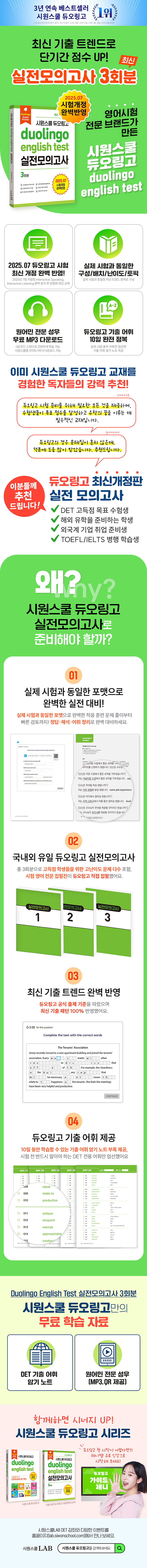 최신 기출 완벽 반영!Duolingo English Test 실전모의고사 3회분01. 2025년 7월 시험 개정 내용을 완벽 반영한 최신 Duolingo English Test 세트02. 실제 시험과 동일한 실전 문제 세트03. 기출 어휘 완전 정복04. 원어민 전문 성우 무료 MP3 다운로드