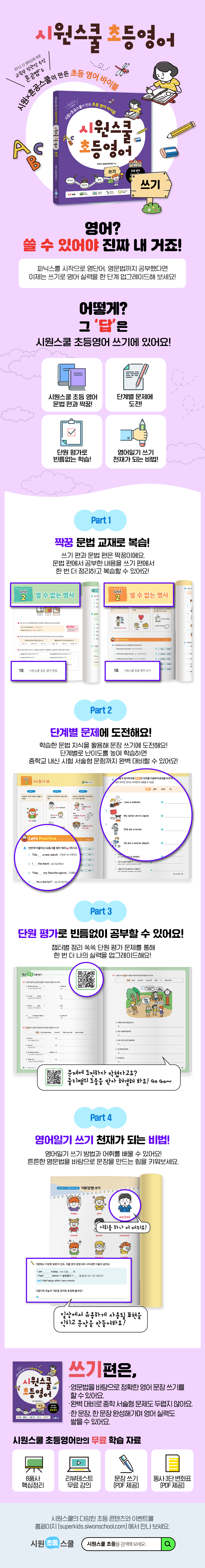 [시원스쿨 초등 영어 쓰기]는 ‘시원스쿨 초등 영어 문법’에서 배운 내용을 쓰기책에서 바로 연계된 복습이 가능하도록 구성하였습니다. 문법책에서 배운 주요 문법 포인트를 ‘시원스쿨 초등 영어 쓰기’에서 한 번 더 그림과 함께 포인트를 정리하고 단계별로 준비한 문제들을 해결하면서 영어쓰기의 자신감을 가질 수 있습니다.