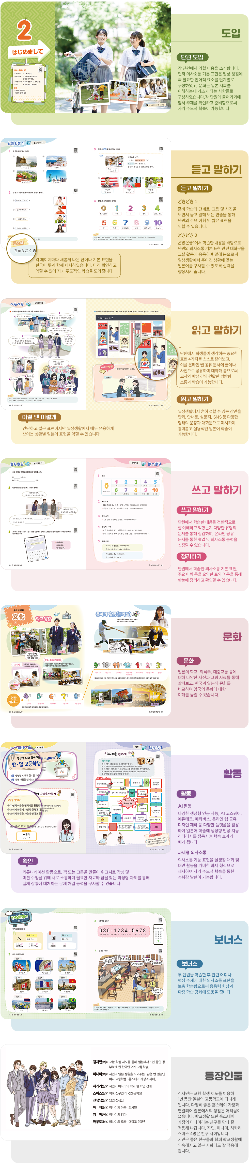 ➋ はじめまして | 1. 자기소개: はじめまして。 2. 타인 소개: こちらは 2ねんせいの ジミンさんです。 3. 외출・귀가: いってきます。 ただいま。 4. 감사: ありがとうございます。 | ●일본의 학교생활 ●일본의 동아리 활동 |